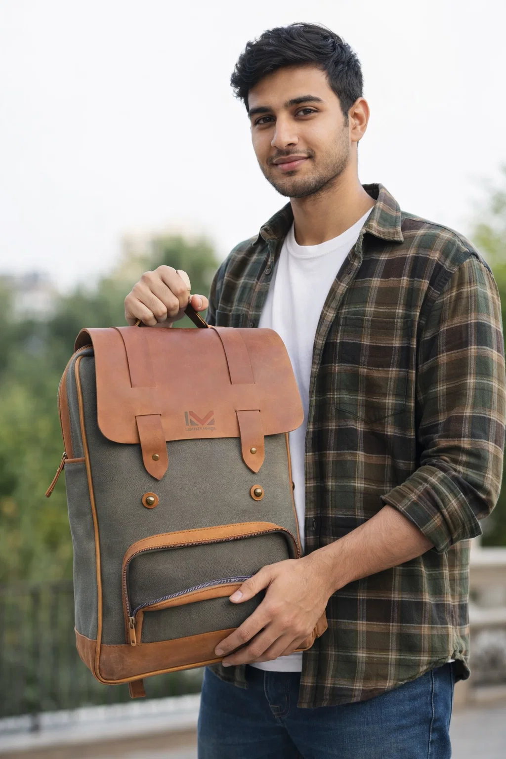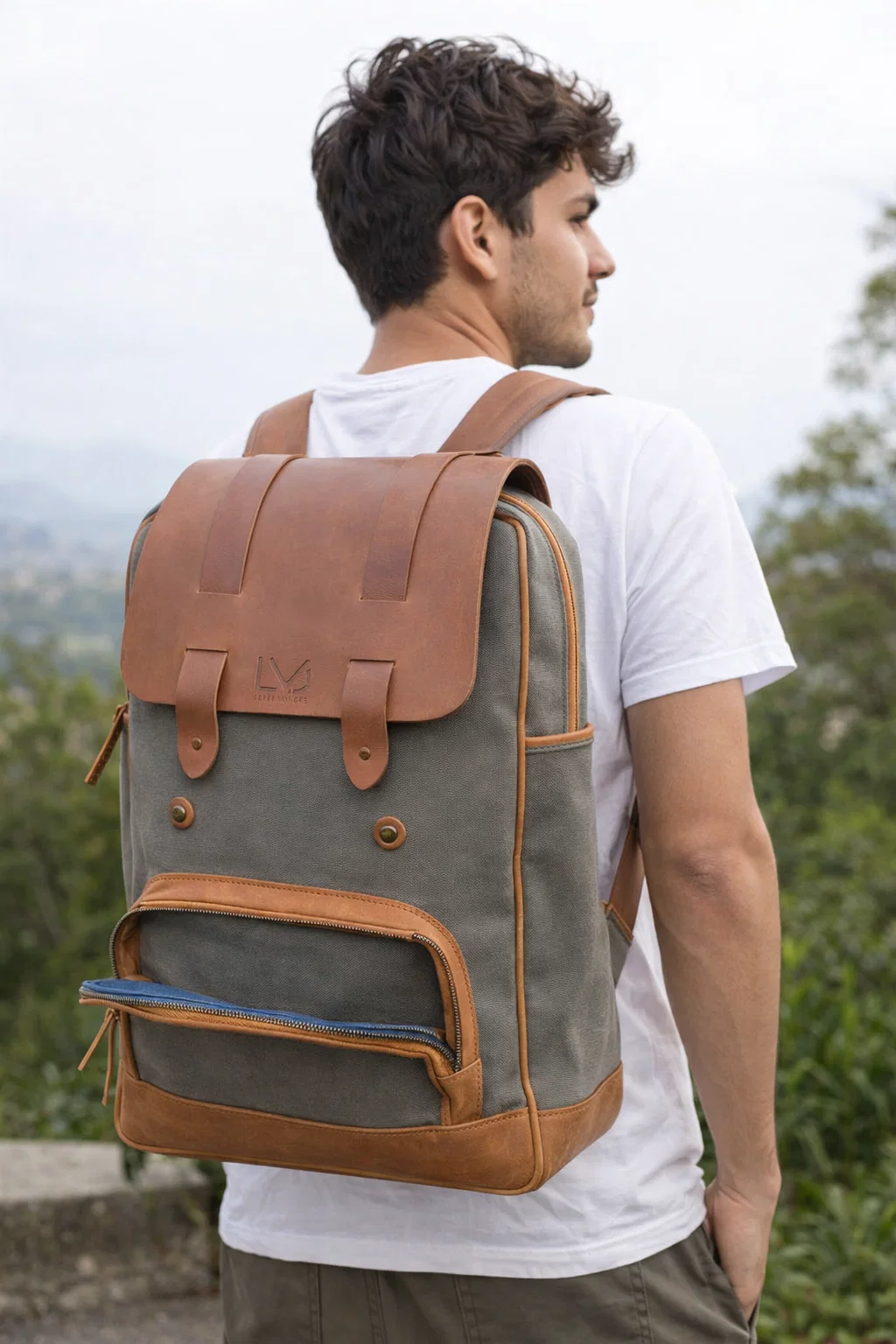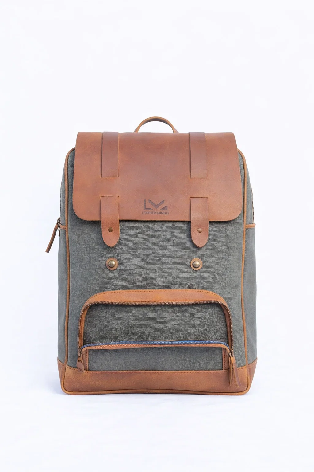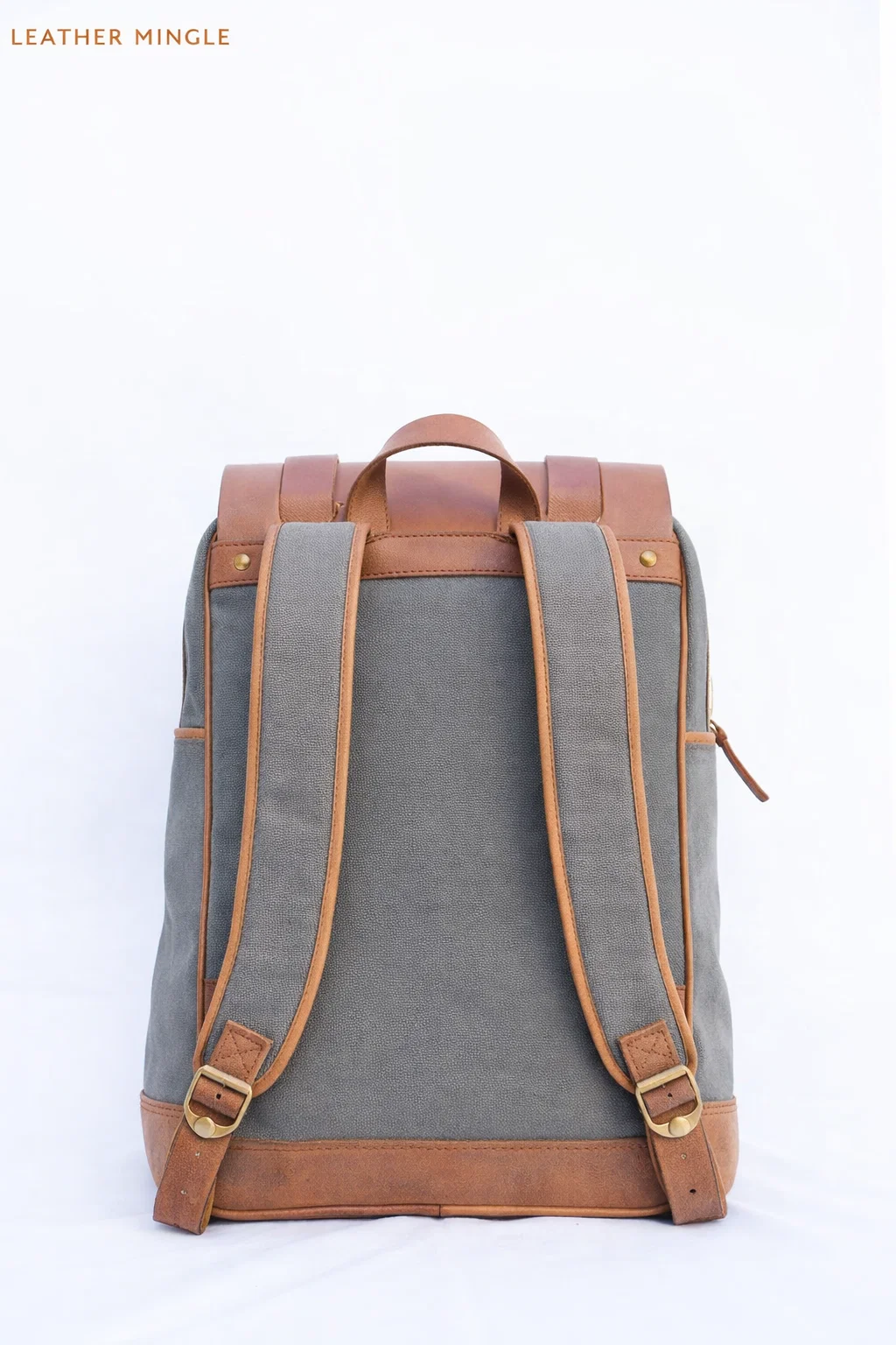 Timelessly carry your essentials with this grey and brown canvas rucksack featuring a durable flap top and premium leather trim. Designed as a vintage grey and brown unisex backpack, it blends rugged utility with modern comfort—ideal for travel, work, or university life.