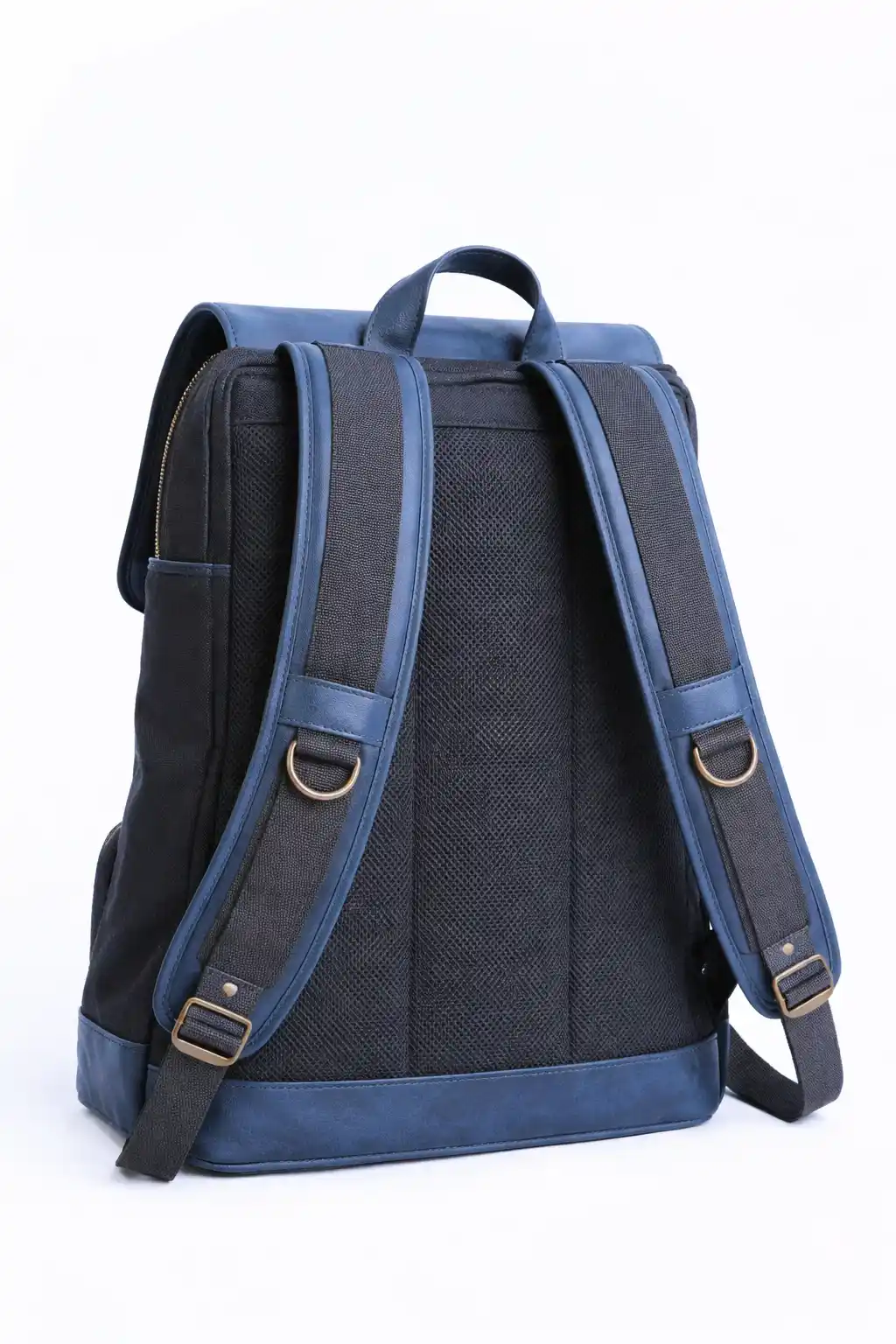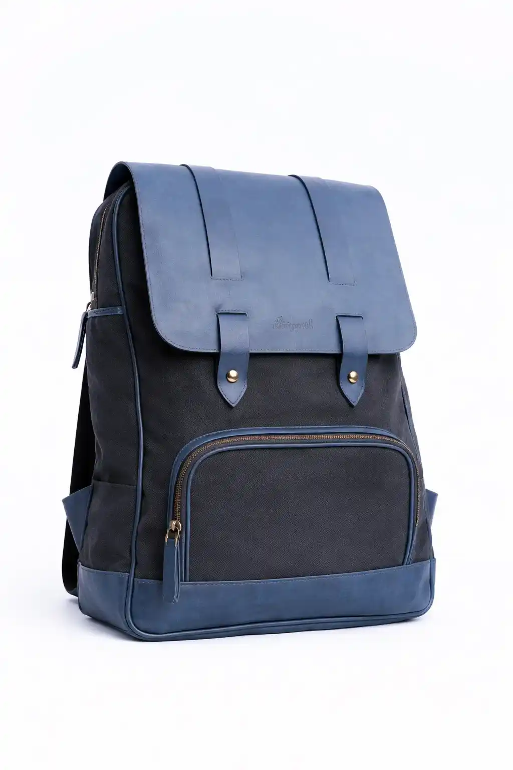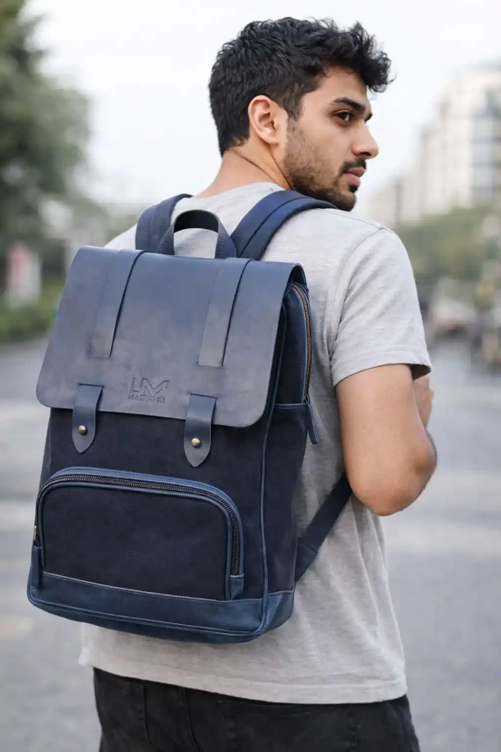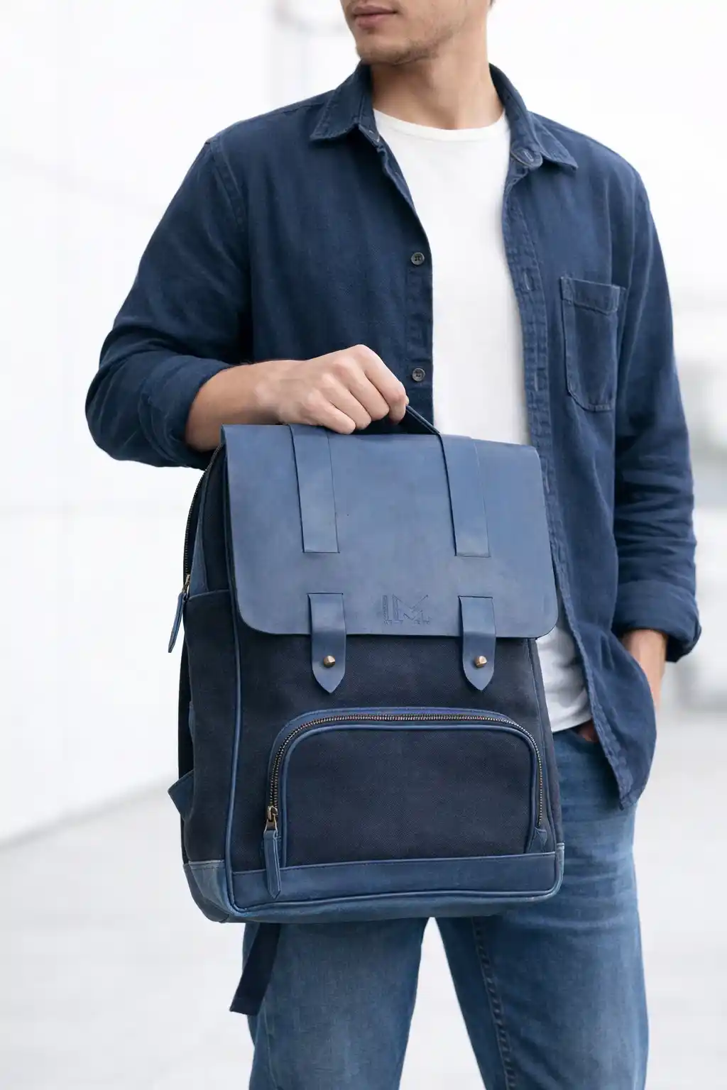 The Modern Blue Leather & Black Canvas Backpack blends contemporary design with everyday practicality. Designed as a Minimalist Blue and Black University Rucksack, it’s perfect for college, work, and travel, offering sleek style with reliable storage.